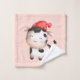 Towel set with an adorable image of a black and white spotted cow wearing a red hat.