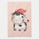 Kitchen towel with an adorable image of a black and white spotted cow wearing a red hat.