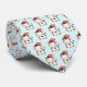 A patterned tie with an adorable image of a black and white spotted cow wearing a red hat.