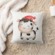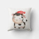 A pillow with an adorable image of a black and white spotted cow wearing a red hat.