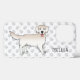 Destei's original cartoon illustration of a cute English cream coat colour Golden Retriever breed dog. The dog has a happy face expression with kind eyes and the dog's pink tongue is showing. There is also a personalizable text area for a name. The background has a pattern of grey dog paw prints.