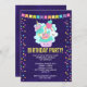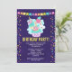 Birthday invitation with a cute illustration featuring a cupcake and ice cream smiling with joy. A rainbow and hearts surround the drawing. A cute fluffy cloud is also