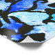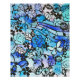 Music, flowers and leaves make up this vibrant painting featuring a floral pattern with a mix of blue tones and black outlines. Different types of flowers as well as leaves, a butterfly and musical notes are tightly packed to create a lively and decorative design.