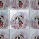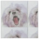 An original Susan Abell dog painting printed on combed cotton in a tile pattern.