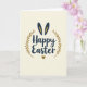 Designed with a tall, centered layout, this Easter card features “Happy Easter” placed in the middle in deep indigo lettering that looks slightly raised. Just above the words, two stylized bunny ears 🐰 appear in the same dark blue, with a soft golden fill inside each ear that adds a gentle glow. A curved garland of golden leaves arches around the top portion, like a spring wreath leaning in close. Beneath the greeting, a small golden heart sits neatly under the last word, adding a quiet romantic touch, like a note left for someone special. The background stays creamy off-white, giving the blue and gold plenty of breathing room and making the design feel calm and close. The text is centered and easy to spot, with the dark blue standing out clearly against the pale backdrop while the gold accents echo around it. The overall look is simple and polished, with the golden botanical arch framing the bunny ears 🐇 above the indigo greeting on the creamy field.