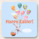 Beverage coasters with my artwork of a cute little rabbit holding onto a bunch of striped balloons floating up into the sky while carrying a basketful of Easter eggs. Customisable text says "Happy Easter!"