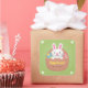 Colourful decor stickers to send your Easter greetings! It has a cute white bunny rabbit popping up from the basket of Easter decorated eggs, a blue egg with yellow stars and a red egg with chevron and dots pattern. The background is a green texture with white spring flowers. Add your Easter message in the basket space provided.