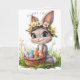 Adorable cartoon style little girl bunny has a cute smile and big happy eyes. She has flowers in her hair. She is sitting in the grass with a basket filled with colourful Easter eggs.