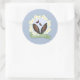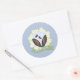 This Happy Easter round sticker features a pretty floral daisies happy easter wreath with grey bunny ears and butterflies on a blue background.