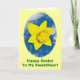 Close-up photograph of nearly perfect yellow daffodil silhouetted against a blue sky with white clouds, yellow matted. This image and design is used to create a love, romantic Happy Easter paper greeting card for girlfriend, boyfriend, lover, or sweetheart.