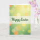 Designed with a soft spring look, this card centers on a wide horizontal band of muted ivory that feels like a calm stage for the greeting. The words “Happy Easter” sit in the middle of that band in a deep leafy green, with smooth, flowing letterforms that look friendly and a little romantic, like a note meant for someone special 🐰. Behind the band, the background fades from a light lime green near the top into a deeper garden green toward the bottom, giving the scene a gentle, outdoorsy setting. Scattered across the greens are glowing, out-of-focus circles that resemble sunlit sparkles, adding a cozy, shared-moment feel, as if two friends are strolling together under spring trees 🌷. The light dots shift in size and brightness, mixing soft yellow, creamy white, and warm orange tones that suggest late-afternoon sunshine. The centered text stands out clearly against the pale strip while the surrounding glow keeps the look airy and dreamy. Large and small luminous circles float across the green gradient, with the brightest ones clustered near the middle and fading softly toward the edges.