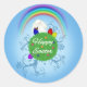 Easter illustration: Easter planet with colorful eggs, cute bunny, butterfly, rainbow, flowers and floral ornaments on a light blue background.