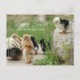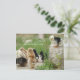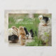 Easter postcard with baby chicks photography. The cutest baby chicks ever are featured on this Easter greeting where one little black and white chick stands on a rock watching a parade of tan, black and yellow chicks pass by. The greeting is easy to customise and could say "Happy Spring" and be used for any occasion. There is no text on the back where the background image is feathers.