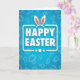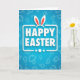 This card features the words “HAPPY EASTER” centered in bright white letters, with a soft shadow that gives them a gentle lift from the page. The text sits inside a rounded white rectangle, like a neat sign, creating a cozy frame that feels like an invitation to come closer 🌷. Two long bunny ears rise over the top edge of the frame, white on the outside with a warm red-orange inner tint, adding a sweet, affectionate touch like a friendly peek 🐰. Everything rests on a sky-blue background that feels airy and open, like an early spring morning. Behind the main design, a faint pattern of lighter blue shapes drifts across the backdrop, suggesting eggs, clouds, or simple animal outlines without taking over. The overall layout is balanced and modern, with the message clearly placed in the middle and the ears adding a gentle, flirty charm above. The white frame and lettering stand out sharply against the blue field, while the pale background shapes remain soft and lightly scattered. The bunny ears extend upward from the top of the rounded rectangle, with their red-orange centers facing forward.