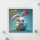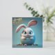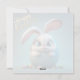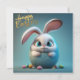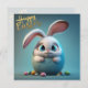 This Easter card is decorated with a cute bunny, with big ears, big eyes and a little pink nose, coming out of an egg, in an animation movie style. He is surrounded by a few small coloured eggs in different shades of pink, blue, green and yellow. The happy and festive message "Happy Easter" is written in gold letters.