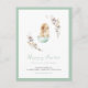 Cute watercolor illustration of a beige coloured bunny in an egg shell surrounded by spring wildflowers and a soft sage green reverse side.