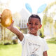 The easter bunny hopping along with a basket filled with easter eggs