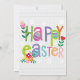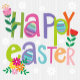 A vibrant and cheerful Easter greeting card design featuring the words 'HAPPY EASTER' in playful, colorful letters. The letters are adorned with striped patterns and surrounded by whimsical flowers and leaves, creating a festive atmosphere. The background is a subtle striped pattern with small floral motifs, enhancing the joyful and spring-like feel of the scene.