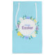 Happy Easter gift bag decorated with flowers and eggs on blue background