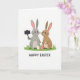 This card shows two long-eared, bunny-like characters standing close together on a small patch of rich green grass, their bodies softly shaded in grey and warm brown. The grey figure on the left holds a small dark sign on a thin stick, angled slightly inward as if offering a sweet note to a friend 🐰. The brown figure leans toward it with a gentle, curious tilt and a tiny front tooth showing, giving the pair a tender, companionable look. Between them sit two decorated eggs: one bright white with scattered golden star shapes and another pink with neat white polka dots 🌷. The background stays plain white, keeping all attention on their closeness and the spring details at their feet. Centered below the illustration, the words “HAPPY EASTER” appear in dark, simple lettering. The text sits in a single line beneath the grass, with the dark sign above it remaining blank and rectangular.