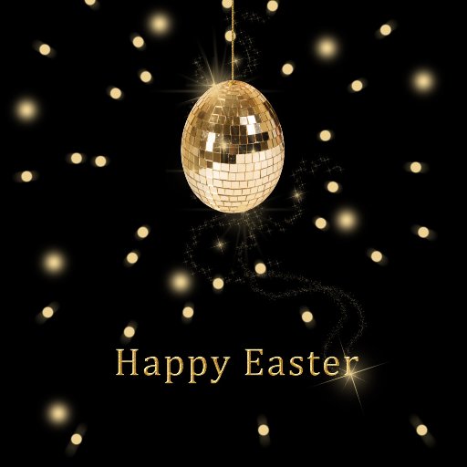 Glamourous Easter party illustration featuring a hanging disco ball in a shape of an easter egg with shiny golden sequins on a black background.