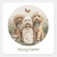 Cute cartoon illustration of Goldendoodle dogs wearing surrounding an easter egg outdoors with butterflies flying around. Perfect for pet lovers or dog parents.