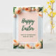 This card sits centered against a vertically paneled white wooden background, giving the scene a calm, homey setting. A slim white border frames a soft peach-pink card, and the gentle color feels like a quiet embrace between loved ones. Across the upper middle, the words “Happy Easter” appear in dark green, flowing lettering, standing out clearly on the warm background 🌷. Beneath that, a smaller line reads “FOR MY GRANDSON AND HIS WIFE” in a neat, simple type style, placed toward the lower center in the same deep green. Around the edges, peach-colored blossoms and closed buds with fresh green stems are arranged like a tender ring, as if softly surrounding the couple named in the message. The flowers’ placement feels affectionate and close, with petals and stems leaning inward toward the text like a shared glance. Soft, diffused light smooths the scene, and the painted wood grain remains visible behind the card while the blossoms show layered petals and tightly curled buds 🐇.