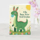 This card shows a tall, friendly green creature with a bunny-like shape and reptile touches, standing front and center with long ears and small red spikes along its back 🐰. Its big eyes and light blush give it a tender, caring look as it gently holds a striped blue egg in its mouth, like it’s bringing a little gift to someone special. Behind it, a creamy yellow sky sets a sunny daytime scene with a bright sun in the upper right and soft clouds drifting nearby. A rolling green hill stretches across the bottom, filled with fine grass blades, tiny yellow flowers, and a few thin brown reeds that add texture. Several decorated eggs in pink, yellow, and blue are scattered around the grass, each with simple stripes and wavy patterns that suggest a cheerful Easter search 🐇. The message “A Big Happy Easter Great Grandson” is placed prominently across the lower area in large lettering that stands out against the green foreground. The text uses a strong, easy-to-read style in a dark tone, with the words spaced to fill the width of the design. In the foreground, the patterned eggs sit among the grass and little yellow blooms beneath the creature’s feet.