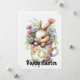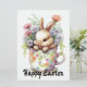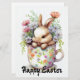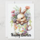 Happy Easter Watercolor Holiday Card with Bunny in a tea cup and flowers
