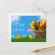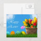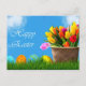 Easter colours, sunny sky, blooming tulips, "Happy Easter," postcard.