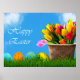 Easter colours, sunny sky, blooming tulips, "Happy Easter."