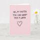 This card sits on a soft blush-pink background that feels gentle and inviting, with a flirtatious edge 🌷. Centred near the top, thick black hand-drawn lettering reads “HA_PY EASTER,” leaving a noticeable gap where one letter should be. Just beneath it, the same black text continues with “YOU CAN INSERT THE P LATER,” turning the missing letter into a cheeky little nudge between close friends or a couple 🐰. The letters look slightly uneven and casual, like a quick note dashed off with a marker, which makes the joke feel more intimate. The strong black text stands out sharply against the pale pink, keeping your eyes on the message and the blank space. Lower on the card, a simple black heart outline sits centred, echoing the relaxed line style of the words and adding a tender, teasing touch. The heart is drawn with a thick black line and rests in the lower half of the pink field.