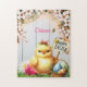 Cute baby chick wishing you Happy Easter with coloured eggs in a basket. you can also personalise this with a girls name