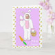 Happy Easter card. Cute purple card with carrot background, with an adorable Easter bunny with your child's picture inside, which you can upload in the personalize area!