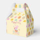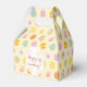 Make Easter extra special with these Happy Easter Pink Bunny Garden Egg Pattern Yellow Favour Boxes! Featuring a whimsical Alice in Wonderland-inspired illustration, this charming design showcases a pink bunny joyfully blowing a trumpet with a heart-shaped flag, surrounded by a vibrant garden of blooming flowers, buzzing bees, and fluttering butterflies with smiling hearts, all set against a soft cream yellow background.
