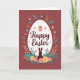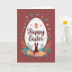 This design shows an off-white egg shape centered on a deep, earthy reddish-brown background, giving the scene a cozy springtime setting. Inside the egg, the words “Happy Easter” sit across the middle in dark crimson lettering that curves smoothly like a gentle handwritten note. Around the egg, a leafy wreath wraps in a near-circle, mixing soft teal, sage green, and warm ochre leaves with small blossoms in coral, peach, and soft pink, like flowers leaning in close 🌷. A smaller patterned egg perches at the top edge of the main egg, colored with an abstract reddish-orange motif that adds a festive accent. Near the lower portion of the white egg, a dark long-eared bunny silhouette 🐇 stands quietly, as if keeping watch with a tender, companionable calm. Tiny coral dots are sprinkled across the white surface, adding light decoration without crowding the central message. The layered leaves and petals look slightly raised against the smooth egg, with the bunny shape grounded at the bottom and the small patterned egg perched above.