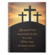 Three silhouette crosses on Calvary and a bible quote from Romans 6:9.