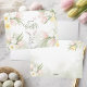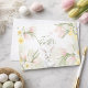 Easter greeting card featuring a watercolor floral border with pastel-coloured pink tulips, yellow daffodils, daisies, and other spring flowers arranged at the corners. The centre has the text "Happy Easter" in a graceful handwritten script font, with "Happy" in uppercase and "Easter" in a larger, flowing cursive style. A watercolor white bunny centred a bottom and a pink butterfly floating at centre top. The background is a soft white with subtle watercolor-like green accents, enhancing the gentle and festive tone of the design. Daffodils and tulips designs and watercolor green background repeated on reverse with space for a handwritten note.