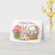 Celebrate the joy of spring with this charming Happy Easter greeting card, featuring a sweet watercolor bunny adorned with a soft pink bow, surrounded by blooming tulips and a basket of pastel Easter eggs.