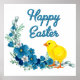 Cute Easter illustration with a baby chick and blue Easter flowers and the words Happy Easter above them.