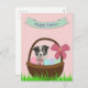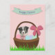 Wish Happy Easter to the ones you love with this cute dog in a pink outfit. This adorable doggie is sitting in an Easter basket along with several colorful Easter eggs. The inside of the card is customizable.
