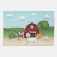 Destei's original cartoon illustration of a cute English cream coat colour Golden Retriever breed dog at a farm. There is a red barn behind the dog with some hay on the side of the entrance. There are also two chickens nearby the dog, a black and white cow behind a fence and a cute sheep by a tree. The background features green grassy hills and a blue sky with clouds.