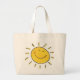 Drawing of a sun with a happy face on a natural coloured canvas bag; the black handles on the bag compliment the black border around the image