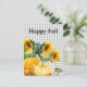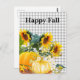 This fall season postcard features pumpkin and sunflowers on a brown gingham background.