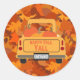 Fun autumn design features a pale orange pickup truck filled with three pumpkins against a mix of autumn leaves background. Tailgate reads Happy Fall Yall.