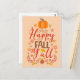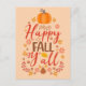 Colourful illustration with "Happy fall y'all" text design and flowers, pumpkin and leaves for everybody who likes fall