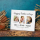 Create a stylish and memorable gift for Dad this Father's Day! This custom tabletop decor sign features a collage of three favourite family pictures of the kids designed as a modern and bold sans serif typography design. Personalise the custom text with the names of the children and modify the black text, red heart, and white background if you would like different colours to coordinate with your home decor.