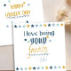 I love being your favorite ... Funny Father's Day Card. The template is set up for you to edit "favorite child" (if you want to have favorite grandson or nephew for example). You can also edit (or delete) the message inside of the card. The design features the cheeky saying "I love being your favorite child" in handwritten typography and is decorated with stars and squiggles. The color palette is shades of blue and mustard yellow. Please browse our store for similar designs or alternative gifts.