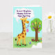 This card shows a stylized long-necked animal on the left, colored in warm ochre and sienna with gentle spots, eyes closed in a soft smile as it holds a patterned oval decoration by a lavender ribbon. The background is a pastel blue sky that feels like an early spring day, and the animal’s calm posture suggests a sweet, caring moment, like it’s bringing a small gift to someone special. On the right stands a simplified tree with a green canopy, its branches hung with more oval decorations in magenta, lavender, and golden yellow, dotted and speckled for extra charm 🌷. Along the bottom, a bright green ground supports the scene, with a small woven basket at the tree’s base overflowing with the same colorful ovals, while a few lie scattered nearby. In the upper left, a fluffy white speech-bubble shape holds the main message in purple lettering, set in clear, thick text that’s easy to read. The layout keeps the animal and tree facing each other across the page, creating a friendly, almost affectionate exchange between the two sides of the scene 🐰. The ovals vary in color and pattern, and several hang from the tree on small loops while others rest near the basket in the grass.