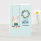 This design shows a sweet illustrated bunny sitting on a wooden swing against a light blue background, with a tender little smile that feels like it’s meant for someone close 🐰. The bunny has soft white fur, pink-lined ears, rosy cheeks, and wears a blue tunic with narrow horizontal stripes, giving it a gentle, friendly look. The swing hangs from two rope lines, and the ropes are wrapped with small white and yellow flowers and thin green vines, like a spring garland. Off to the upper right, a round floral wreath adds a romantic, caring touch, mixing blue, white, and yellow blooms with leafy green sprigs 🌷. Inside the wreath, the text “Happy 1st EASTER” sits prominently in blue near the top, with “Great Grandson” placed beneath it in a flowing, cursive-style blue lettering. A faint pale-blue grid pattern spans the background, adding light texture without distracting from the main scene. The wreath’s circular shape and the swing’s curved seat stand out against the soft grid, with blossoms clustered along the ropes and around the wreath edge.